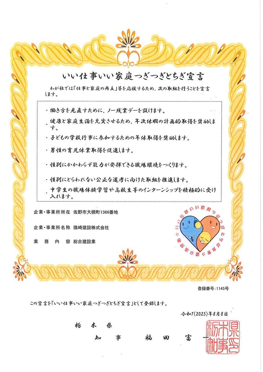2025年8月8日、栃木県にいい仕事いい家庭つぎつぎとちぎ宣言を登録しました。