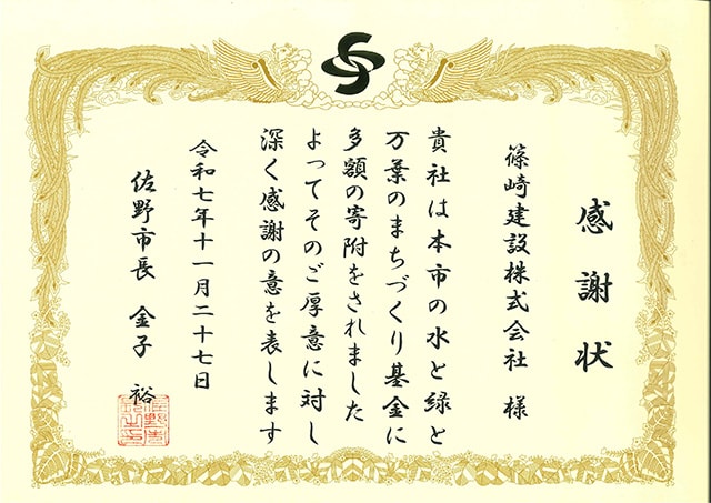 2025年 11月28日 2025年11月27日 佐野市様より感謝状を賜りました。 2025年11月27日(木)、佐野市様より「水と緑と万葉のまちづくり基金」に寄付をしたことに対して、感謝状を賜りました。